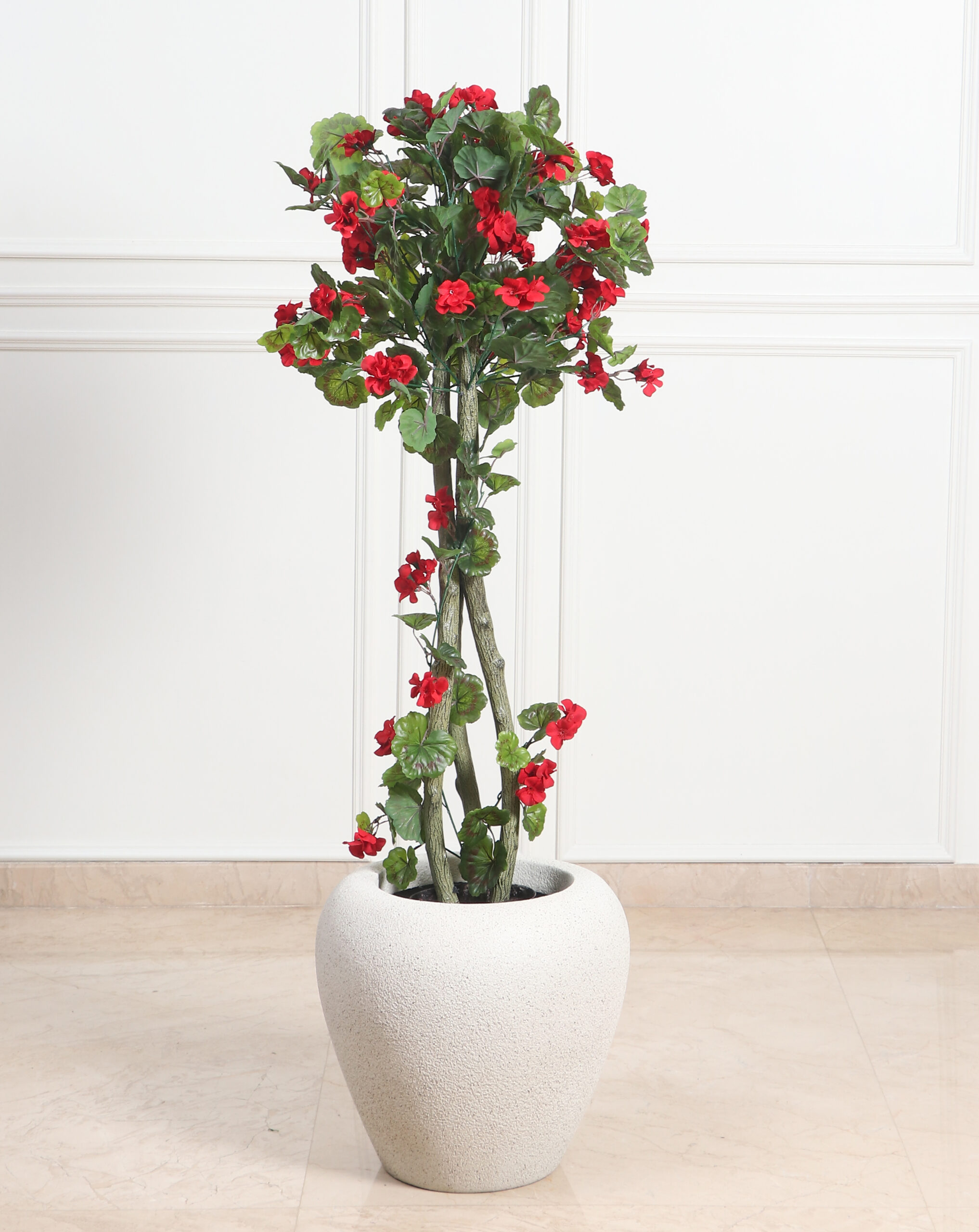 | Bring vibrant color and charm into your home or office with this 52-inch Artificial Geranium Tree. Featuring a realistic PU trunk and lush fabric leaves, this tree captures the natural beauty of geraniums in full bloom. Housed in a sturdy fibre-reinforced plastic (FRP) pot, it is lightweight, durable, and easy to move, making it a perfect décor piece for living rooms, balconies, offices, or commercial spaces. Enjoy the appeal of a blooming tree year-round without the hassle of watering or sunlight, creating a fresh and inviting ambiance effortlessly. |